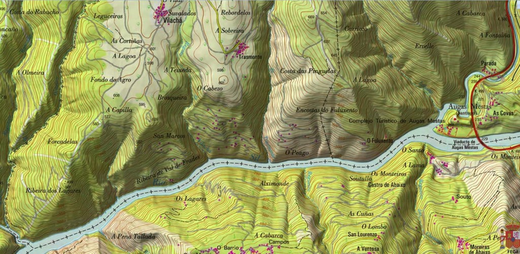 En el mismo documento se señalan sus límites: “Desde Villa Plana (Vilachá) a Ambas Mestas (Augasmestas) por el regato de Feruginetum (Fuluxento) y por el río Sil a Agares (Lagares) y desde aquí a Villa Plana (Vilachá).